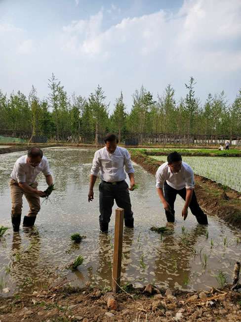 日前,星空app·网站官网-星空(中国)董事长梁雨、总裁谢俊率集团高级管理人员来到位于北京西四环外的锦绣大地生态园,在景色迷人的玉泉山山下,同志们挽起裤脚跃进田里,生态园农业技术员一边弓腰示范,一边讲解道“插秧是个技术活,将秧苗窝在虎口处,既要轻又要稳,用巧劲儿将秧苗抛在泥里,不能抛得太深,又要确保植保灌溉时,秧苗不漂浮在水面上。”